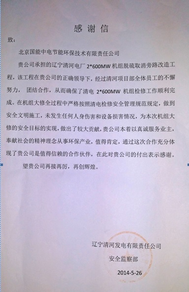 在公司總部的正確領(lǐng)導(dǎo)下,經(jīng)過遼寧清河電廠2*600MW機(jī)組脫硫取消旁路改造工程項(xiàng)目部全體員工的共同努力,確保了該工程業(yè)主安全目標(biāo)的順利實(shí)現(xiàn),受到業(yè)主公司安全監(jiān)察部表揚(yáng),也充分體現(xiàn)了我們國能中電是值得信賴的合作伙伴。