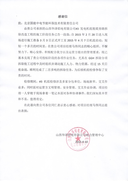 山西華澤鋁電旁路改造EPC項目受業(yè)主表揚