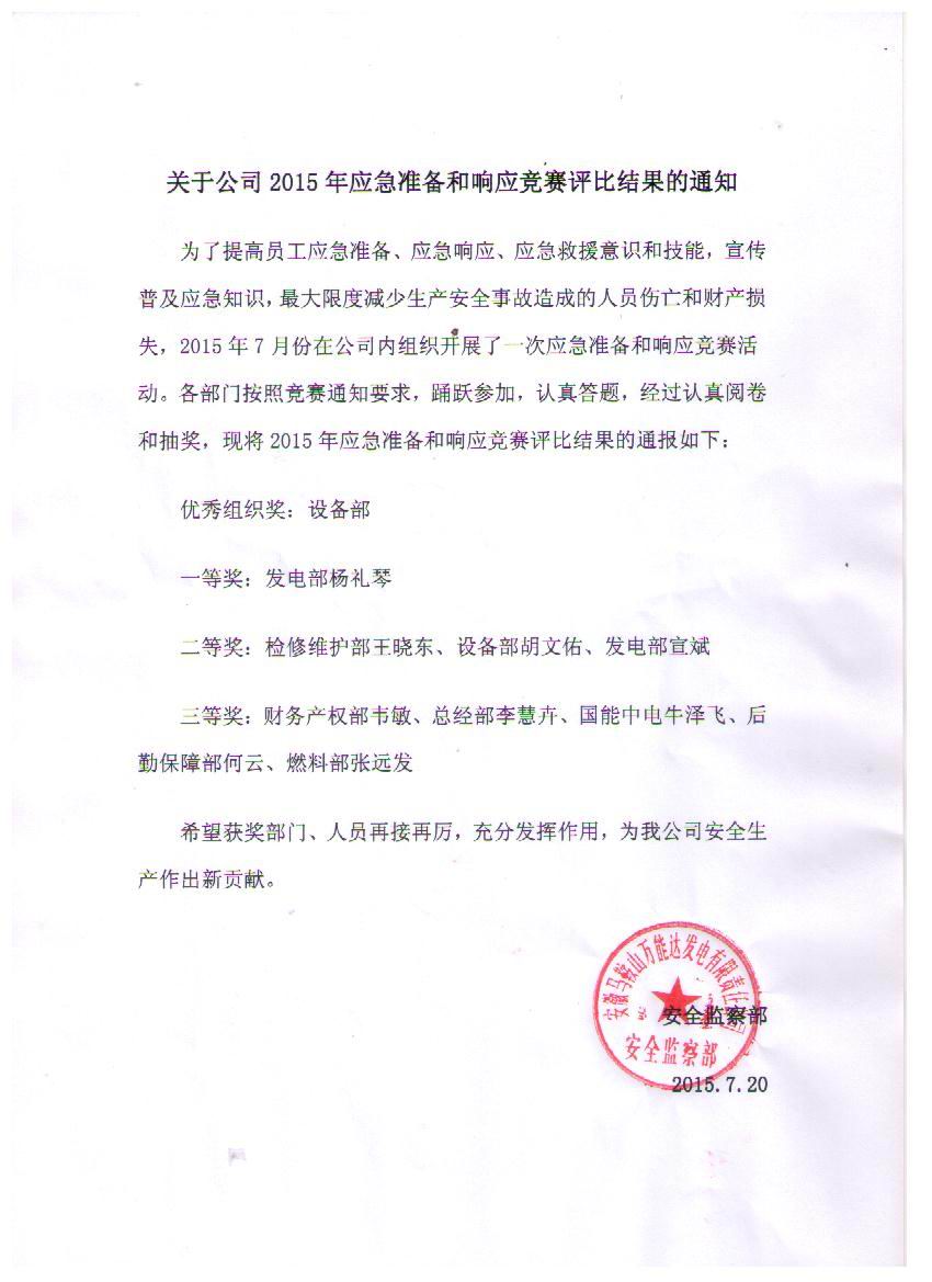 為了提高員工應(yīng)急準備、應(yīng)急響應(yīng)、應(yīng)急救援意識和技能,宣傳普及應(yīng)急知識,馬鞍山項目部業(yè)主萬能達電廠于2015年7月組織開展了應(yīng)急競賽,我公司牛澤飛獲得三等獎,牛澤飛是獲得獎項的唯一非電廠員工,牛澤飛的獲獎及展示了公司風貌,又體現(xiàn)項目的安全教育頗有成效,既了強化了員工的安全意識,也提高了員工處理應(yīng)急突發(fā)情況的能力。