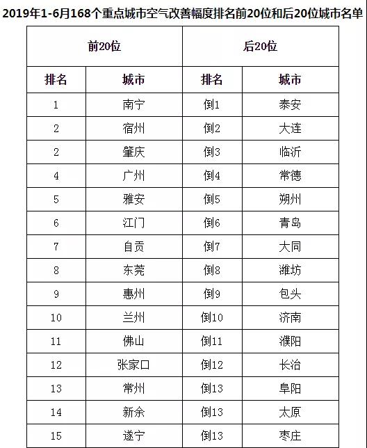 從空氣質(zhì)量同比改善程度看,2019年1-6月,168個重點(diǎn)城市中南寧、宿州、肇慶市等20個城市空氣質(zhì)量改善幅度相對較好(從第1名到并列第19名);泰安、大連、臨沂市等20個城市空氣質(zhì)量改善幅度相對較差(從倒數(shù)第1名到倒數(shù)第20名,見附表3)。