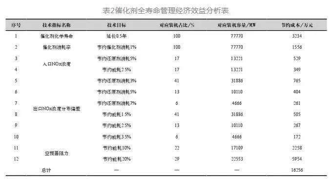 以某1000MW機(jī)組為例,假設(shè)能夠?qū)⒋呋瘎┗瘜W(xué)壽命由3年延長至3.5年、節(jié)約還原劑耗量5%、降低脫硝及空預(yù)器運(yùn)行阻力300Pa,則可年節(jié)約催化劑成本50萬元、還原劑成本40萬元、能耗(水、電、汽耗)成本160萬元,總計(jì)可節(jié)約脫硝運(yùn)行成本250萬元/年。假設(shè)國內(nèi)某發(fā)電集團(tuán)192臺77770MW SCR脫硝機(jī)組催化劑統(tǒng)一實(shí)施全壽命管理模式后,基于當(dāng)前運(yùn)行現(xiàn)狀,通過折算對應(yīng)裝機(jī)的催化劑采購成本、還原劑消耗成本、能耗成本,如表2所示,可節(jié)約脫硝運(yùn)行費(fèi)用約1.63億元/年。因此全壽命管理模式實(shí)施后,將能夠有效提升脫硝裝置運(yùn)行可靠性、減少脫硝裝置運(yùn)行成本。